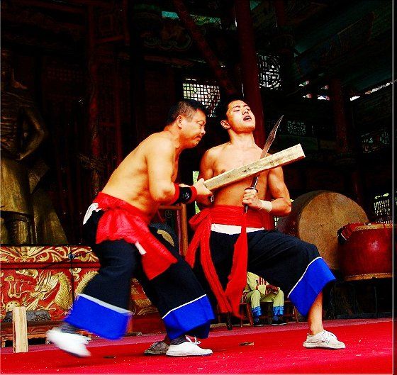 大庸氣功 大庸氣,堪稱武林奇葩,曾為祖國贏得聲譽,海內(nèi)外享有極主名望。 大庸氣功是大庸各民族特別是土家族傳統(tǒng)體育項 目之了,分健體氣派、武術(shù)氣功兩類。前者有“返還 功”、“馬王推氣功”、“少林達摩醫(yī)療保健氣功” 等;后者有靜坐、壁虎、靈子、二指彈、碎石、松靜 、硬氣、五禽、五陽功等,尤以硬氣功著稱。大庸硬 氣功,歷史悠久,漢代相單程,明代覃后,清代劉明 燈,當(dāng)代湯子模、周鐵鞭、杜心武、趙繼書等都具有 超人硬氣武功。大庸土著民族在漫長的反征服、反壓 迫斗爭,博采武當(dāng)、少林南北派、昆侖派眾家武林精 華,創(chuàng)造出獨此一家的大庸硬氣功。 據(jù)傳,大庸硬氣功鼻祖是楚國鬼谷子?!?a class="insidelink" href="http://www.58dst.com/cityinfo/15580531721.html" title="永定區(qū)">永定縣 志》有關(guān)鬼谷子隱居天門山鬼谷洞潛心學(xué)《易》、傳 授方術(shù)的記載。到清代有武林高手朱茂嶺,隱居三岔 村北芭蕉灣洞,研究鬼谷氣功之術(shù),后收西溪坪胡口 子、余世萬(即“余通人”)為徙,傳其衣缽。余通 人將武術(shù)氣功系統(tǒng)整理,發(fā)揚光大,播名于世。 新中國成立后,黨和政府十分重視民間氣功發(fā)掘 整理,并正式列為體育項目加以普及發(fā)展,今日大庸 市習(xí)練硬氣功達數(shù)萬人眾。永定區(qū)官黎坪村世有“硬 氣功之鄉(xiāng)”盛譽,該村男女老幼,練功已蔚成風(fēng)氣, 其武師趙繼書,1979年先后參加全省和全國武術(shù)大賽 ,均獲一等獎,受到國家體委重視,同年7 月趙繼書 專程到北京給中央領(lǐng)導(dǎo)同志匯報表演。嗣后,隨同中 國武術(shù)代表團和國家領(lǐng)導(dǎo)人先后兩次出國,到盧森堡 、意大利、比利時、羅馬尼亞、馬其他和東南亞等國 家訪問。他表演的臥刀碎石、頭頂開石、雙鳳灌耳、 頭碰石柱、叉尖推磨等精彩節(jié)目,博得外國友人好評 。盧森堡一位榮獲國家獎牌的武士,看了表演后連夜 來到中國大使館,將自己珍藏多年的獎牌贈送給他; 盧森堡國王主動熱情走上臺與趙繼書熱情擁抱,連連 稱贊:“了不起!了不起!國際氣功大師!”并把珍 藏紀(jì)念章一枚贈送給趙繼書。一位法國朋友十分贊賞 說:“中國的氣功,稱為全人類的寶貴財富,是有科 學(xué)道理的。”自此,大庸硬氣功譽滿全球。湖南瀟湘 電影制片廠專門拍攝了彩色紀(jì)錄片《大庸氣功》。 大庸硬氣功共有二十多個項目,最有影響的是: 腹臥鋼叉 由二人在地面扶住一根叉尖朝上的三 股鋼叉,叉尖猁鋒利,然后一個俯身叉尖,尖抵腹部 ,待其四肢平展懸空,扶叉二人轉(zhuǎn)動鋼叉,謂之推磨 。表演時,要求臥叉者運氣于腹,氣意集中,稍有大 意,叉即穿腹而過。 臥刀破石 先固定兩把大刀,刀口朝上,臥刀者 運氣后,由其他人抬臥于刀口上(有仰臥、俯臥兩種) ,然后在臥刀者腹部或背部置一碩大石條(約數(shù)百斤) ,一人或兩人輪大鐵錘狠擊石條直至斷裂破碎為止。 釘?shù)洞财剖?地上倒一層碎玻璃片,一人仰臥其 上;然后腹上置釘床,又一人仰臥釘床上,再于第二 人腹上置釘床,第三人仰臥刀床上,腹部上壓一塊數(shù) 百斤大條石,由人掄錘狠砸,至石破為止。 銀槍刺喉 用一根兩頭安有鋒利槍頭的鋼槍,抵 置兩位表演者喉部,然后相對發(fā)力,至槍桿抵成彎弓 形而喉部安然無恙。 徙手?jǐn)嗍?表演者將堅滑如鐵一塊卵石置于石凳 (地)上,然后運氣于掌或指擊斷(碎)卵石。 踢腿斬石 表演者運氣于腿,以腿踢斷石條。一 般可踢斷15公分以上厚度的麻石條或青石條。 胸部打刀 將鋒利大刀刃口置于胸部肌肉上,用 一根拳頭粗木棒猛擊刀背,至棒斷而胸部無傷。 新中國成立以來,大庸民間武術(shù)與民族體育逐漸 融為一體,發(fā)揮著提高人民身體素質(zhì)、弘揚中華武術(shù) 傳統(tǒng)和增進國際友誼重大作用。除硬氣功外,還有數(shù) 十種武術(shù)形式散見于民間武術(shù)體育活動之中。如打飛 棒、扭扁擔(dān)、抵搭斗杠、擠油渣、甩抱腰、舉石鎖、 板牛角(一種斗牛形式)等等。其特點是因地制宜, 不分場地,凡田園地角院壩集鎮(zhèn),都是習(xí)武練功、開 展活動的處所,頗具泥土氣息。擬或以生活中某些動 作和動物的某種形態(tài),稍加模仿演繹,便成某一獨特 武術(shù)形式。如天門武術(shù)功夫大師余道人所創(chuàng)造的“宮 天梳”、“巖燕樸天門”等;也有就地理特點創(chuàng)造某 種武功形式的,如“蕩藤”等。 以上部分圖片均來自互聯(lián)網(wǎng),出處不詳,請作者與本站聯(lián)系。 |