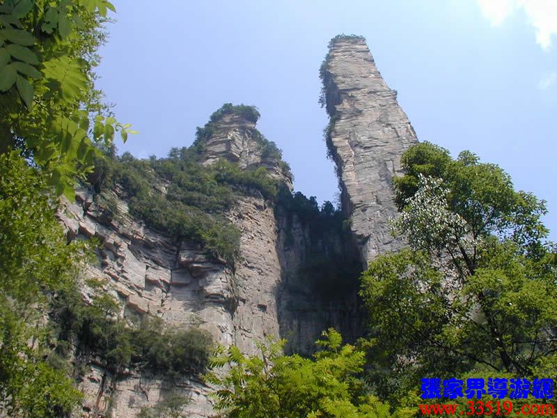 (金鞭巖、神鷹護(hù)鞭)如果要問張家界國(guó)家森林公園的標(biāo)志景點(diǎn),答案是現(xiàn)成的:金鞭巖。早在清代中期,一些文人就把張家界的峰林及百丈峽列入“永定八景”。其一叫“危峽啼猿”;其二叫“層巖涌塔”:“縣西二十里青崖山,其前五山并立,層峙如浮圖。中一峰更峻拔,上插宵漢,晴輝雪積,最擅奇觀。”這里說的“其中一峰”,指的金鞭巖。八大景點(diǎn)張家界占其二,可見先人是有眼力的。金鞭巖相對(duì)高度380多米,拔地而起,直插云霄,無論你遠(yuǎn)看近看,正看側(cè)看,都是一根刺破青天的長(zhǎng)鞭!在金鞭巖左側(cè)的那座巖峰,大家看多像一只兇猛的老鷹,勾嘴瞪眼,雙翅略展,時(shí)刻警覺地守護(hù)著金鞭,人稱“神鷹護(hù)鞭”。