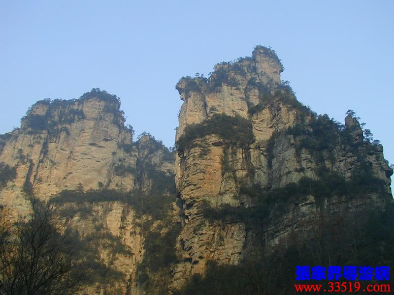 (亂竄坡)左邊這個(gè)坡,相傳向王天子兵敗后主力部隊(duì)從這里撤退上袁家界,進(jìn)天子山。這時(shí),官兵追上來了,埋伏上的士兵一刀砍斷葛藤,滾木擂石潮水般砸了下來,打得官兵四處亂竄,以后就把這個(gè)坡叫“亂竄坡”。從亂竄坡可以上著名風(fēng)景游覽線袁家界,那里有后花園、迷魂臺(tái)、天下第一橋、天懸白練瀑布;還可以取道上天子山、進(jìn)楊家寨。大家抬頭看,就是這座孤峰,叫羊寨,那里是一片原始森林。