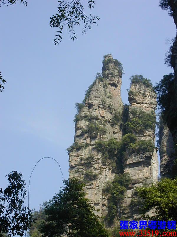 (花果山、水簾洞)孫悟空的花果山水簾洞到了。并不是張家界人過于牽強(qiáng),胡亂把西游記的事兒往這兒湊,實(shí)在是巧合,《西游記》劇組的導(dǎo)游楊潔及唐僧、豬八戒、孫猴子、沙和尚等飾演者,一見到這地方就十分肯定地說:外景地選遍全國(guó),只有張家界才真正是《西游記》筆下的神仙妖魔世界。大家順著我的指向往前看,左前方是帶著僧帽,披著袈裟,嘴中念念有詞的唐僧,緊跟在他后面的那座黑乎乎的石峰當(dāng)然就是沙和尚了;神通廣大的孫猴子半蹲在唐僧后側(cè)手搭涼篷,正在觀察敵情呢;豬八戒哪去了?不用說,不是貪吃貪睡,就是偷偷找小女子搭訕去了,花心去了。