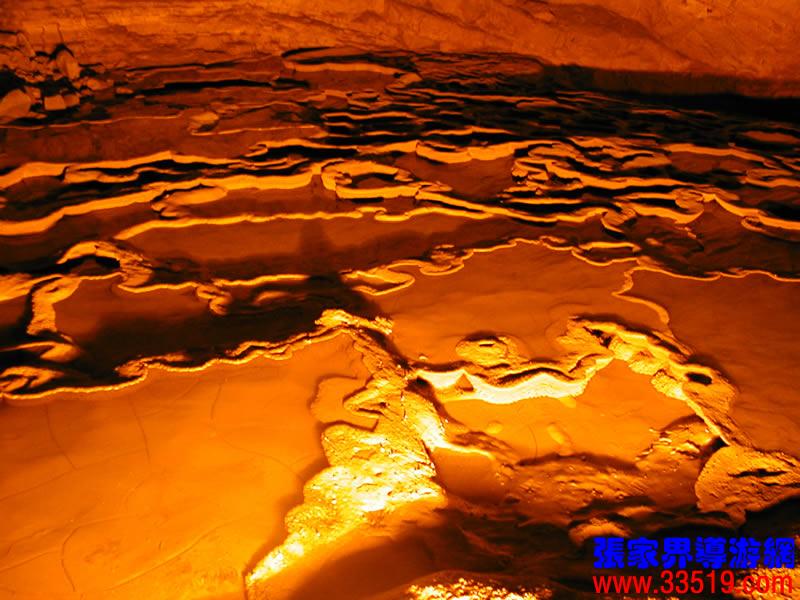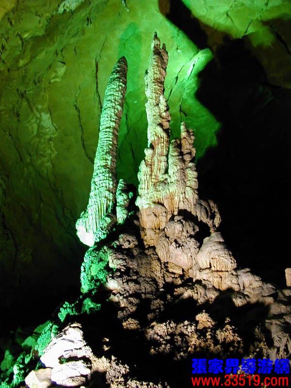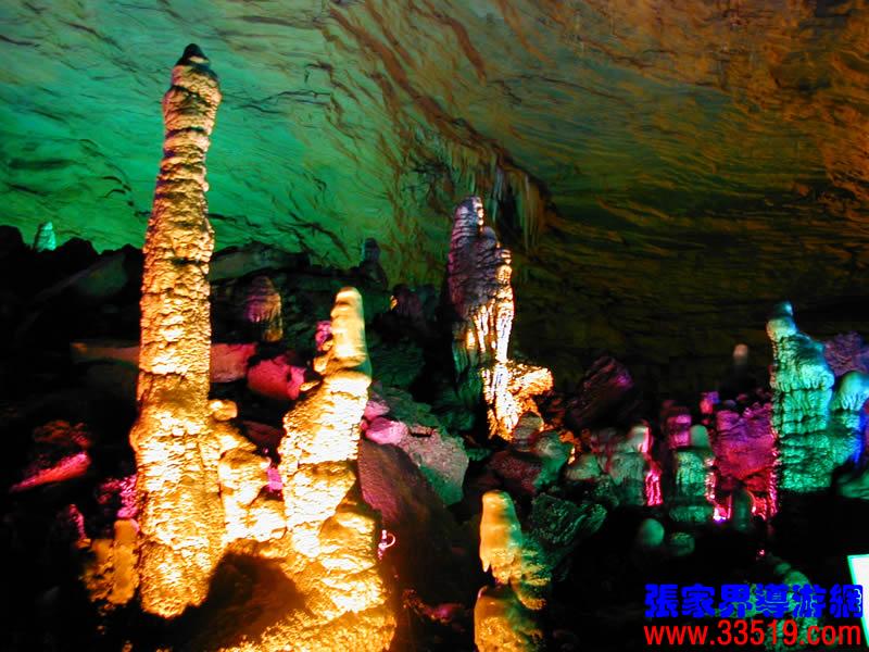 (龍宮)龍宮是黃龍洞十三個(gè)大廳中最大的一個(gè),也是景色最美的景點(diǎn)之一,底面積15000平方米,平均高40米,兩千余根石筍拔地而起,千姿百態(tài),異彩紛呈,或如飛禽走獸,或如宮廷珍藏,有的像巍巍雪松,有的像火箭升空。龍宮后園有金銀兩座花池,清水常溢,花簇盛開(kāi)。宮頂鐘乳柳垂簾掛,四周壁畫(huà)栩栩如生。溶解著各色各樣的礦物質(zhì)的水,從巖層中滲透出來(lái),滴落下來(lái)。礦物質(zhì)在洞頂凝固結(jié)晶成倒懸鐘乳石,從鐘乳石滴落的水又把礦物質(zhì)澆疊、堆壘在洞底,而長(zhǎng)成節(jié)節(jié)向上的石筍。大家看看這龍宮的造型,領(lǐng)略這磅礴的氣勢(shì)。洞內(nèi)最大石筍,高12米、直徑10米的漢白玉天然石椅“龍王寶座”居高臨下,眾多石柱石筍似人似物,維妙維肖,圍著寶座朝拜山呼,幾十座珊瑚亭亭玉立,儼然一支龐大的“宮廷樂(lè)隊(duì)”。湖南著名教授羊春秋先生作《寄生草》詞對(duì)此進(jìn)行描繪:“百態(tài)千姿模樣,三宮六院門巷。龍王開(kāi)宴設(shè)瓊漿,猴王偷果鬧天堂,君王納寵擁羅帳。搬演了人間爭(zhēng)攘,匯集了天下奇觀。”