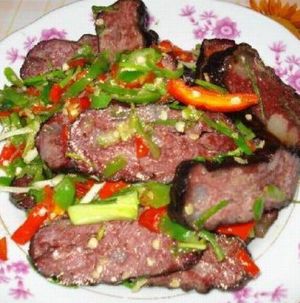 名稱: 血豆腐 介紹: 血豆腐,就是將豆腐和豬血、豬肉及花椒、辣椒等佐料拌成泥狀,捋成卵形,以竹篩置火炕上,煙熏烤成臘黃,吃起來(lái)耐嚼味香,是土家特色菜,當(dāng)?shù)厝顺R云湎戮啤?在張家界的飯館里很難吃到正宗的土家特色菜,可以去做土味的特色餐館去解解饞。但是最正宗還是鄉(xiāng)下人家家里自己熏的,那才叫一個(gè)好吃?。。?/p>