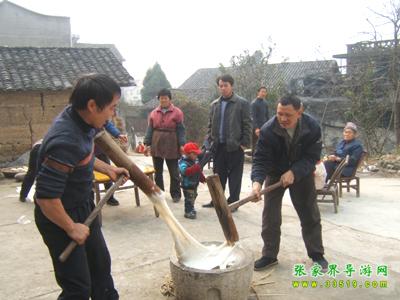 土家人民素有“二十八,打粑粑”的說(shuō)法。每逢春節(jié)來(lái)臨,農(nóng)歷臘月末,家家都要打糯米糍粑,所謂打糯米糍粑,據(jù)當(dāng)?shù)剜l(xiāng)土志書記載:“系糯米飯就石槽中杵如泥,壓成團(tuán)形,形如滿月。大者直徑約尺5,尋常者約4寸許,3至8分厚不等。”打糯米糍粑是一項(xiàng)勞動(dòng)強(qiáng)度較大的體力活,一般都是后生男子漢打,兩個(gè)人對(duì)站,先揉后打,即使冰雪天也要出一身汗。做粑粑也很講究,手粘蜂臘或茶油,先出砣,后用手或木板壓,要做得玉圓光滑,講究美觀。