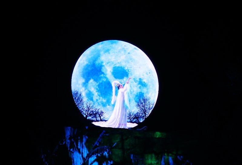 本項目觀眾劇場及主舞臺總占地面積19880平方米,其中全景舞臺10000平方米,采用玻璃鋼設(shè)計,通過燈光效果可通體透亮,營造出奇幻場景。整個表演區(qū)包括:中心舞臺、左側(cè)的人間世界,右側(cè)的狐貍世界、左前歌隊歌臺、后演區(qū)梯田與木橋?qū)嵕肮参鍌€演區(qū)。