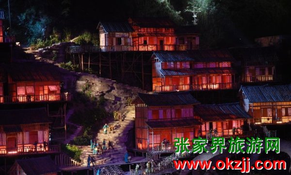 是目前世界第一臺有完整故事情節(jié)的山水實景音樂歌舞劇。舞臺選址在天門山風(fēng)景區(qū)山門口內(nèi)至天門山頂?shù)恼麠l峽谷,總投資達(dá)到1.2億元,演員隊伍達(dá)530多人。主舞臺以10000平米的玻璃鋼打造,是目前世界最大的全景玻璃鋼舞臺。