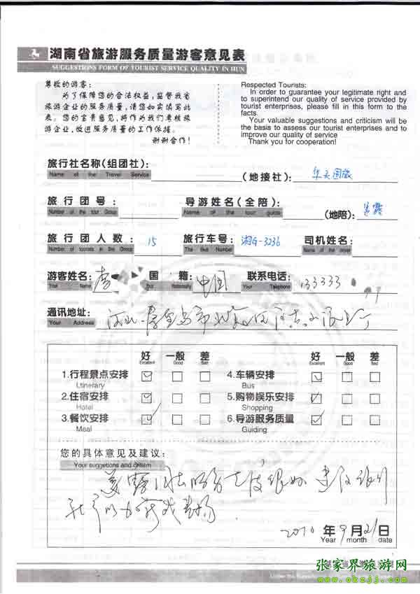2010年9月21日河北李先生一行15位旅游質(zhì)量反饋:服務很好