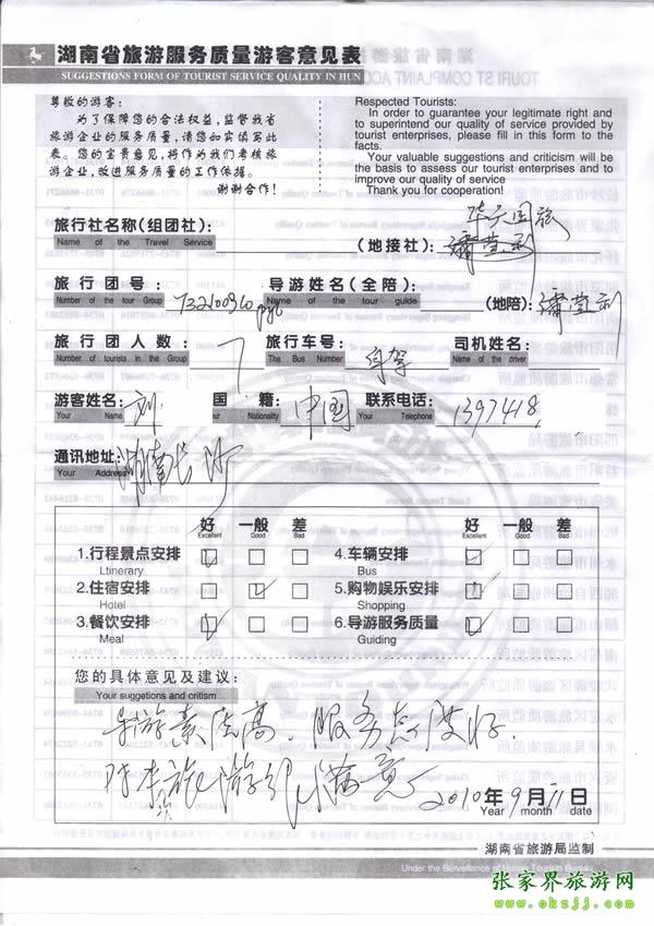2010年9月10日劉先生對(duì)導(dǎo)游的素質(zhì)高,態(tài)度好,很滿(mǎn)意