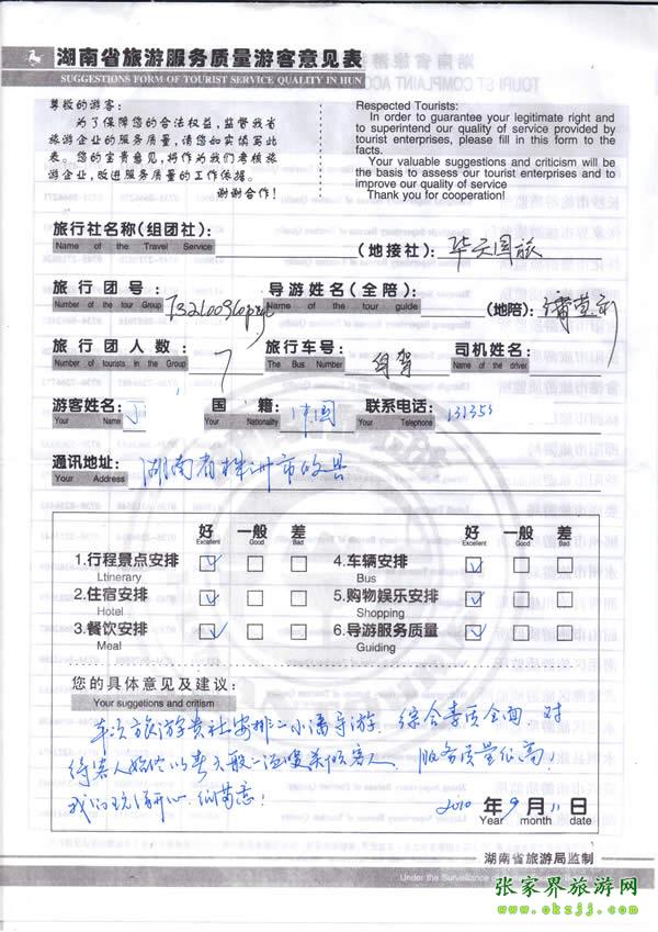 2009年湖南丁先生/女士說導(dǎo)游素質(zhì)高,我們很開心很滿意!