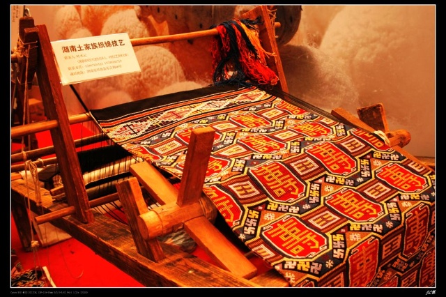 土家織錦在境域民間主要用于被面及小孩用的窩窩被、腳被、蓋裙,亦是姑娘陪嫁、定情及民俗活動(dòng)跳擺手舞時(shí)的披甲和祭祀用于堂前的壁掛。土家錦的圖案主要源于生活,已知名的達(dá)100余種,大致分為6大類:動(dòng)物題材有馬畢(小馬)、石畢(小動(dòng)物)、陽雀花、燕子花、大龍紋、小龍紋、蛇花、貓腳跡、風(fēng)紋、蝴蝶牡丹和老鼠嫁女等;植物題材有蓮花、韭菜花、九朵梅、巖墻花、大刺花、藤藤花等;日常用具題材有椅子花、桌子花、箱子八勾、豆腐架、桶桶花、船船花、鋸齒花、梭子花、背簍花等;抽象幾何勾狀紋有單八勾、雙八勾、四十八勾、十二勾、二十四勾及勾紋變種紋飾;以吉祥文字表現(xiàn)的有福祿壽喜、萬字流水、一品當(dāng)朝及田字紋、壽字紋等;取材天象的有太陽花、整月花、半月花、梭羅花、滿天星等。 土家錦的織造方式,歷代沿用自漢代以來的腰機(jī)式斜織機(jī)。民間織機(jī)一般長約5尺,寬約2尺多,高約3尺。所用材料,為蠶絲或棉線,用棉葉、棉梗、茜草、土靛、紫莓、土紅、黃珠子等物染色。