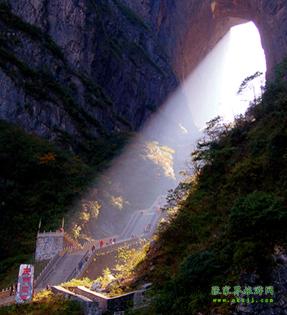 中國(guó)最高的自然“天門洞” 公元263年即三國(guó)吳永安永安六年時(shí),吳王孫休見其高峻雄偉,巍峨壯觀,便將武陵郡分置天門郡,從此天門冊(cè)名傳遐邇,譽(yù)貫古今。天門洞周圍簇涌著丹灶,老僧、玉壺、玉堂、金匱、筆架、將軍、箭桿、漆圓、弩牙、猿點(diǎn)、天姥、負(fù)兒、簸箕、雞籠、高遠(yuǎn)等16座山峰,其間又鑲嵌著雷、電、風(fēng)、云、泥、蛇、龜、祖師、玉皇、鬼谷、果老、玄天、合山、求兒、鐘鼓、老龍等16洞府,幽默盤亙,使得天門山在雄偉之中又增添了神奇和秀麗。流水清洌的澧河為天門山頻映倒影,寬廣低平的田疇為其鋪就如茵綠毯,繁茂的森林裝點(diǎn)著山基和山頂,淡云薄霧為她峨冠霞佩,朝暉夕照為她斜染紅裝。隨著四季的更替,她春茵夏碧秋金冬縞,呈現(xiàn)出無窮的變幻。天門山生態(tài)系統(tǒng)給天門洞的神奇增添了新的魅力。 據(jù)說,天門洞開景區(qū)的有上天梯。有著九百九十九級(jí)臺(tái)階的上天梯!