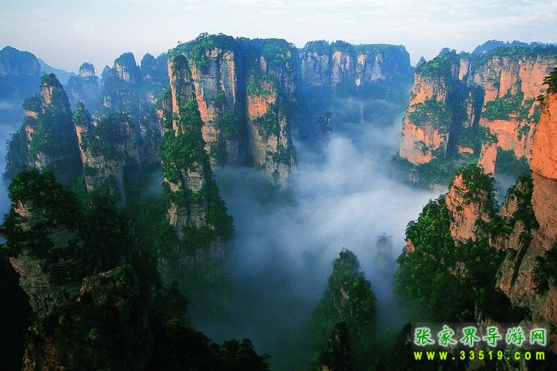 第二天早上,我們參觀了袁家界的風(fēng)景,其中最有名的當(dāng)然數(shù)天下第一橋,這是由兩座巖石山的山頂自然生長(zhǎng)在一起,非人所能為也。天下第一橋的稱(chēng)號(hào)當(dāng)之無(wú)愧啊。當(dāng)然在袁家界,后花園也是不能不看的。張家界號(hào)稱(chēng)“峰三千,水八百”,在這里你就能明顯的感覺(jué)到這句話的前半句是那么的實(shí)在??赐陱埣医绲暮诵脑医纾覀兂塑?chē)到了天子山(張家界景區(qū)內(nèi)的最高的地方)。玩了賀龍公園、御筆峰、仙女散花、西海、石船出海、仙人橋、天子廟、十里畫(huà)廊、一步難行。不巧的是,那天山上下了一點(diǎn)陣雨,雨后一條彩虹掛在天上,更重要的是山上起了一點(diǎn)霧,使整座山都籠罩在霧中,若隱若現(xiàn),看上去就象是在云海中,好象老天特地配合我們似的,難得一見(jiàn)的西海等正好被我們趕上了。江導(dǎo)告訴我們,這樣的機(jī)會(huì)是很難得的,可能是張家界為了感謝我的再次到來(lái),給了我一個(gè)特別的禮物吧。我大笑。晚上趕到昨天住的地方去住宿。不提。
