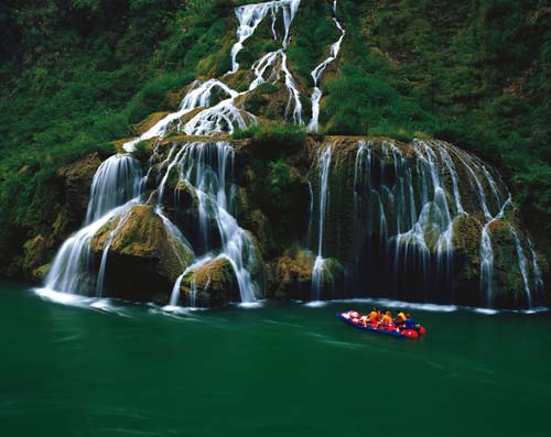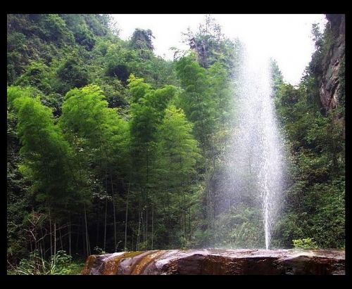 在金鞭溪游覽過程中,可見一組奇峰,有兩座較高的石峰緊密相連,下半截連為一體,上半截一高一矮,高者略欠身,低者稍后仰,好一幅相愛擁抱的絕妙畫面,恰似一對久別重逢的夫妻,故名相會峰,亦稱千里相會。相傳東海龍宮小龍女常來此地觀賞風景,一次偶然的機會,結(jié)識了峨眉山遠道而來的后生,二人情投意合,很快便產(chǎn)生了愛情。龍王知道此事以后,非常惱怒,決意拆散二人,多次將小龍女關(guān)在龍宮,但小龍女想方設(shè)法逃出來,常常與情人相會。龍王一氣之下,將二人點化成石,便成石峰“千里相會”。 十一、茅巖河漂流