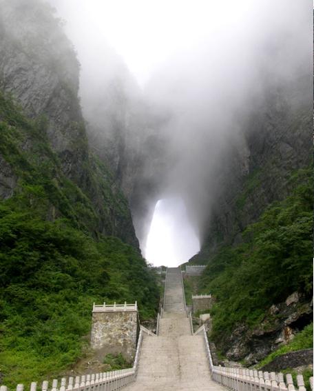 天門山上有一個(gè)天門洞,2006年03月,曾有俄羅斯之戰(zhàn)斗機(jī)在此表演飛躍天門洞的表演,還造成滿大的轟動(dòng)。上天門洞之前,必須先征服999個(gè)階梯,經(jīng)過(guò)一番努力終于登上天門洞之后,突有豁然的感覺(jué),人在山上,卻仍然在洞中,從這里更可以鳥(niǎo)瞰整個(gè)張家界市的景色。用完晚餐后,即乘車從張家界回車長(zhǎng)沙。